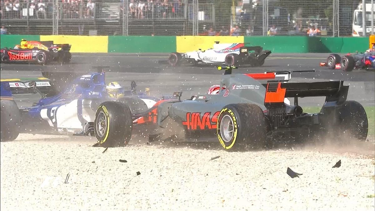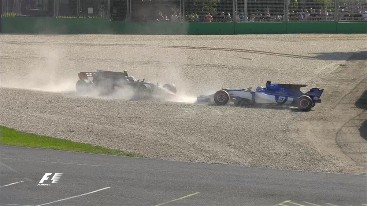 1-й круг. И столкновение на первом круге! Магнуссен и Эрикссон вылетают с трассы - желтые флаги у нас.