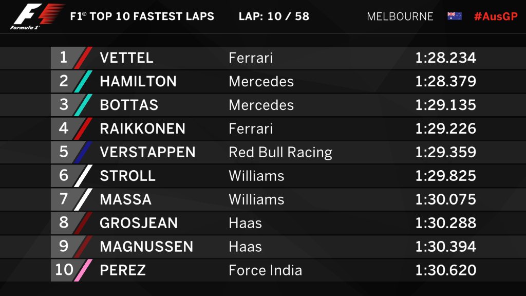 13-й круг. А вот таблица быстрых кругов к этой минуте. Феттель все же опережает Хэмилтона в этой борьбе.