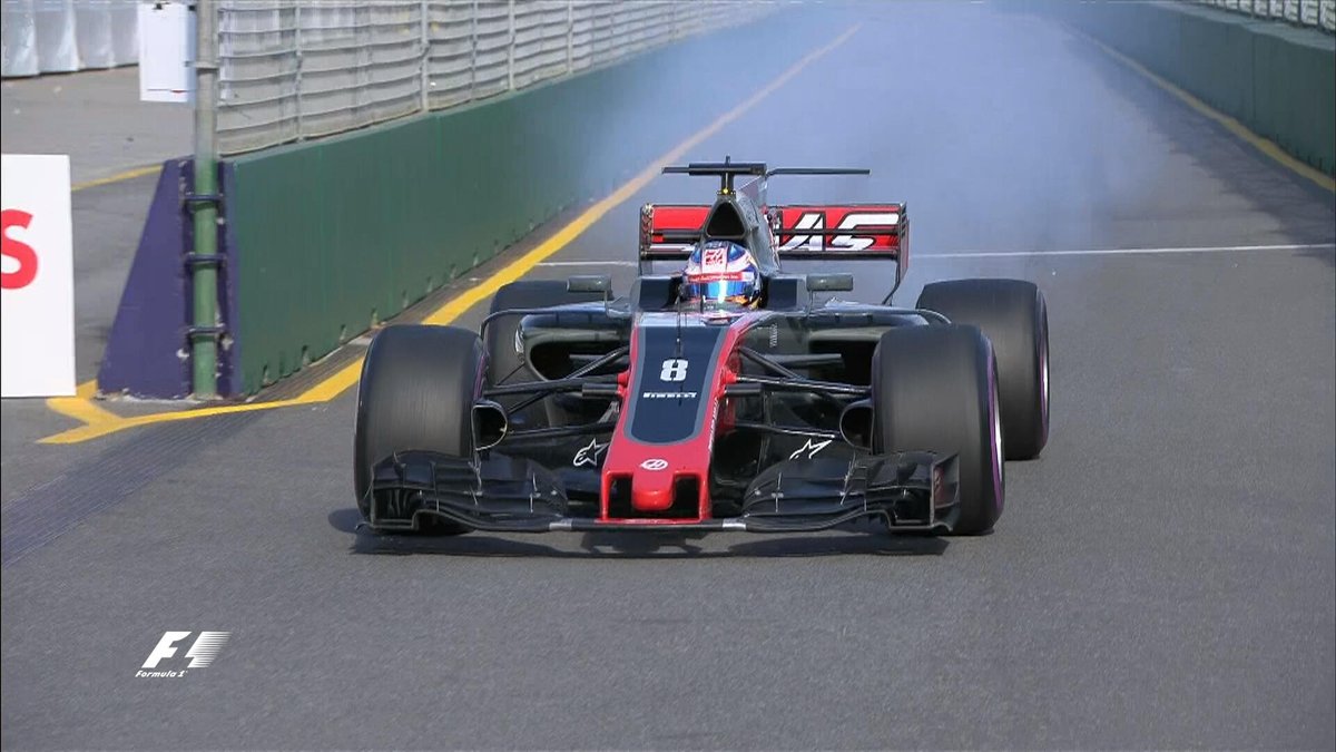 15-й круг. Грожан сворачивает в боксы с дымящимся двигателем. И сходит с дистанции. Что-то явно пошло не так.