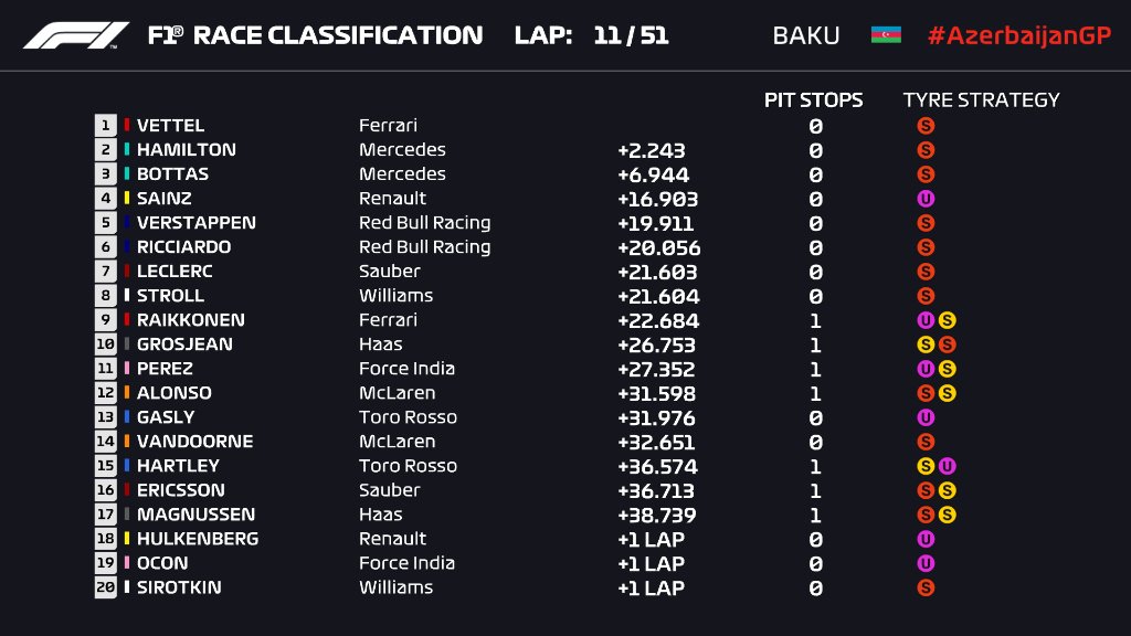 Великолепная и непредсказуемая гонка! Неожиданный сход на первом круге для Сергея Сироткина, который удачно провел квалификацию. Тоже самое можно сказать и про Окона. Авантюрная борьба "Ред Булла" лишает команду очков. Ну и какой горячий финал! Кто ждал сход Боттаса? Кто думал, что Перес будет на подиуме? "Гран-при Азербайджана" приподнес много сюрпризов. На этом мы с вами прощаемся, до встречи в Испании!