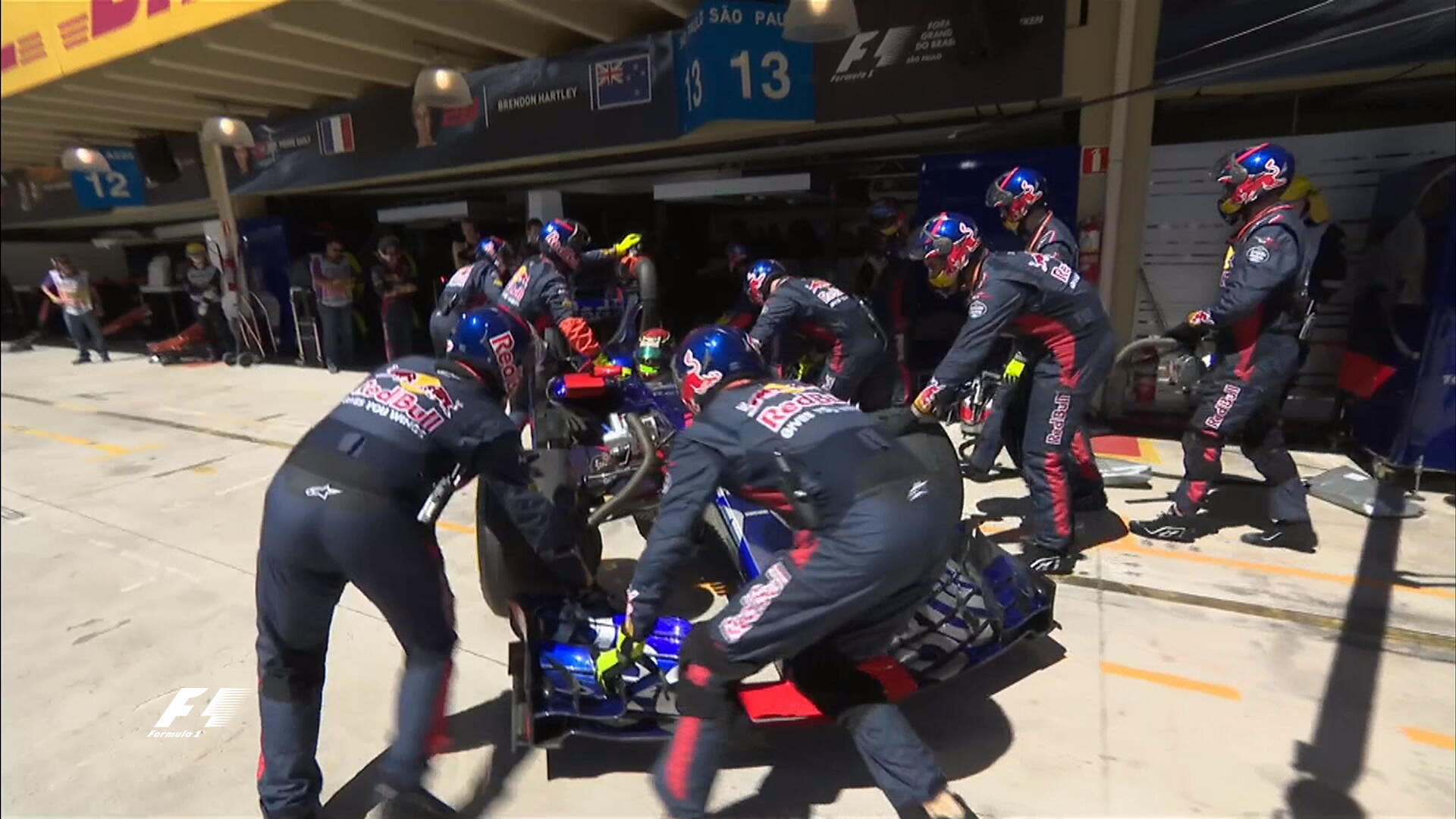 Второй круг. Все проезжают через пит-лейн, а кто-то успевает заглянуть на пит-стоп.