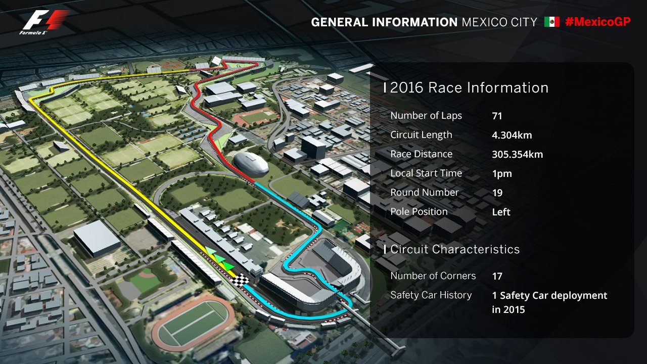 В гонке пилоты пройдут 71 круг по 4304 метра каждый. На трассе 17 поворотов: 7 правых и 10 левых. Колебания высот от 2226 до 2229 метров на уровне моря. Этот автодром требует от гонщика хорошей физической подготовки.