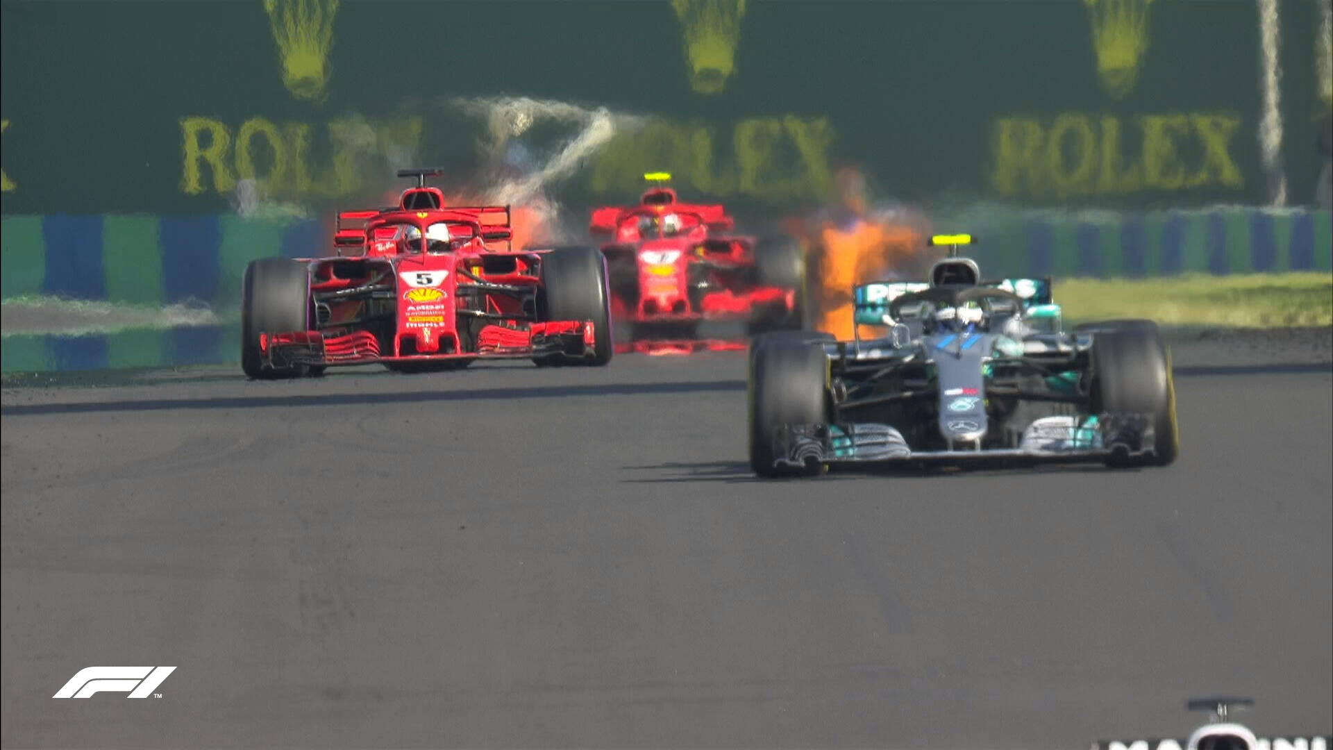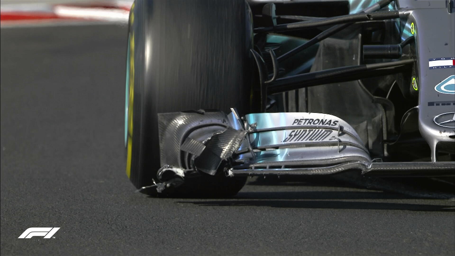 Боттас! Пытался отбится от атак сразу обоих пилостов "Феррари" и ломает себе переднее крыло об болид Феттеля!