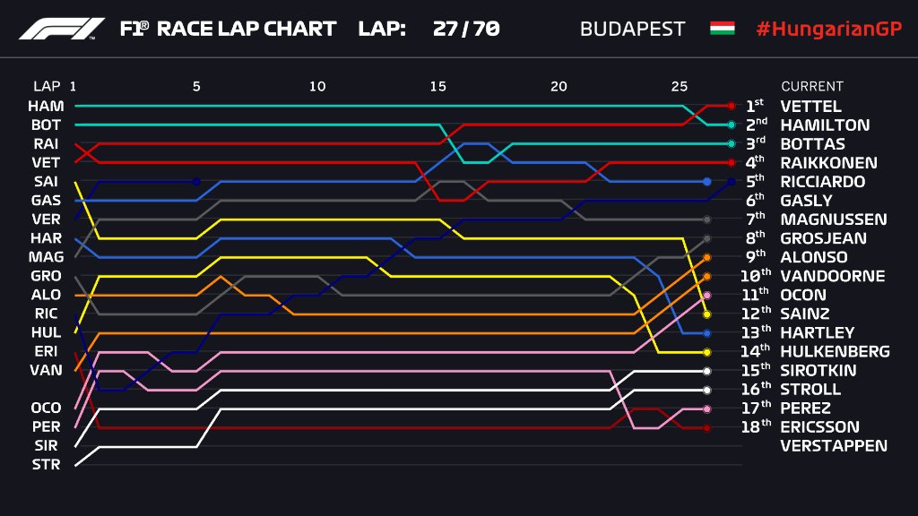 Лидеры все те же. Хэмилтон, Боттас, Феттель и Райкконен. Идут плотно, только лидер чуть впереди. А вот Риккьярдо отстает на 17 секунд.