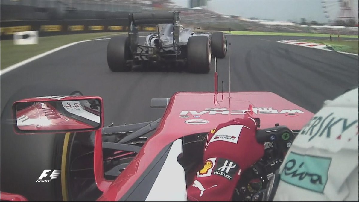 37-й круг. Феттель "вцепился" в Хэмилтона и уже заходит на атаку. Борьба за третье место! Но пока Льюис не дает сопернику шансов.