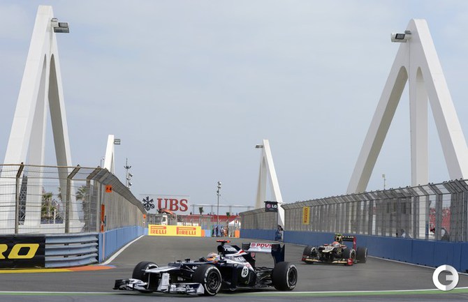 Формула-1. Валенсия. Чемпионат мира. 8-й этап. "Гран-при Европы". 1-е свободные заезды. 1. Мальдонадо (Венесуэла, "Уильямс") - 1.40,890. 2. Феттель (Германия, "Ред Булл") - 1.40,973. 3. Уэббер (Австралия, "Ред Булл") - 1.40,984. 4. Баттон (Великобритания, "Макларен") - 1.40,994... 20. ПЕТРОВ (Россия, "Катерхэм") - 1.43,209. Фото AFP