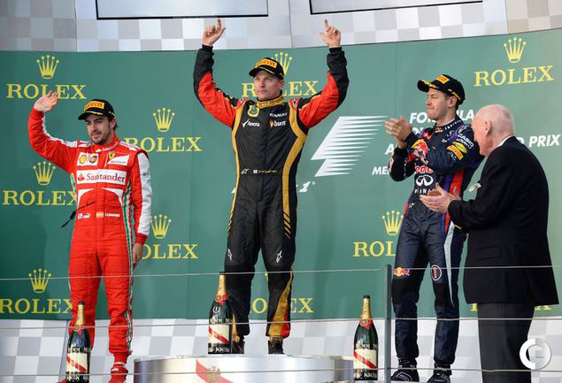 Мельбурн (Австралия). Чемпионат мира. 1-й этап. "Гран-при Австралии". 1. Райкконен (Финляндия, "Лотус") - 1:30.03,225. 2. Алонсо (Испания, "Феррари") - отставание 12,451. 3. Феттель (Германия, "Ред Булл") - 22,346. 4. Масса (Бразилия, "Феррари") - 33,557. 5. Хэмилтон (Великобритания, "Мерседес") - 45,561. 6. Уэббер (Австралия, "Ред Булл") - 46,800. 7. Сутиль (Германия, "Форс Индия") - 1.05,068. 8. Ди Реста (Великобритания, "Форс Индия") - 1.08,449. 9. Баттон (Великобритания, "Макларен") - 1.21,630. 10. Грожан (Франция, "Лотус") - 1.22,759. 11. Перес (Мексика, "Макларен") - 1.23,467. 12. Вернь (Франция, "Торо Россо") - 1.23,857... Фото REUTERS
