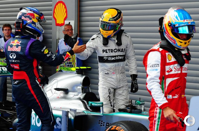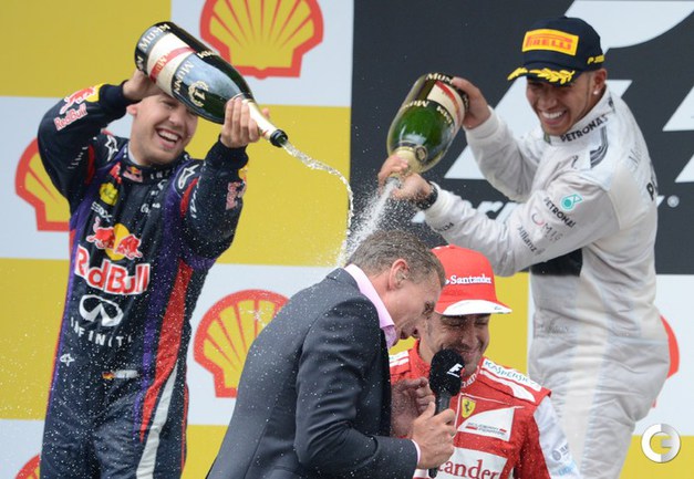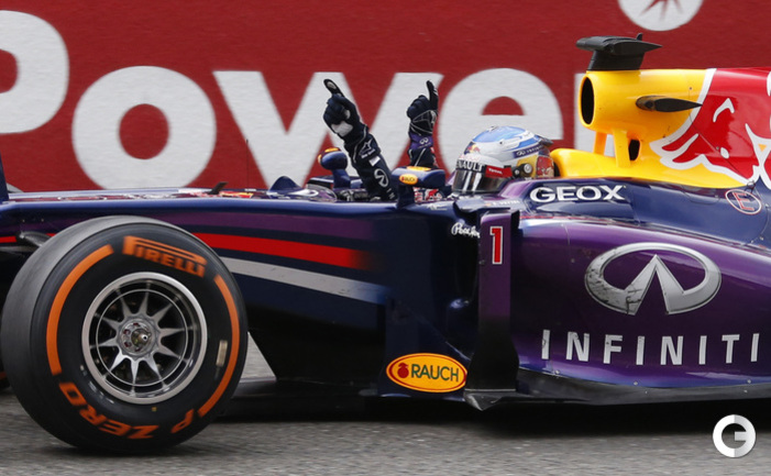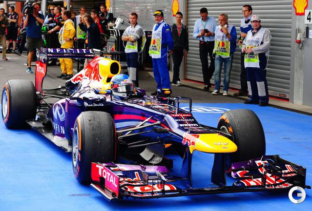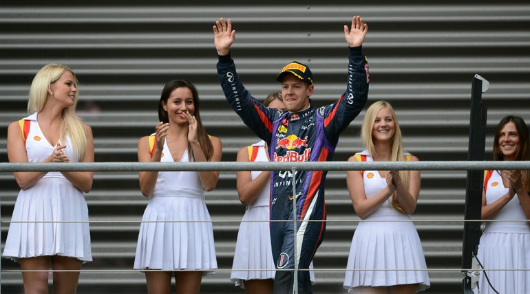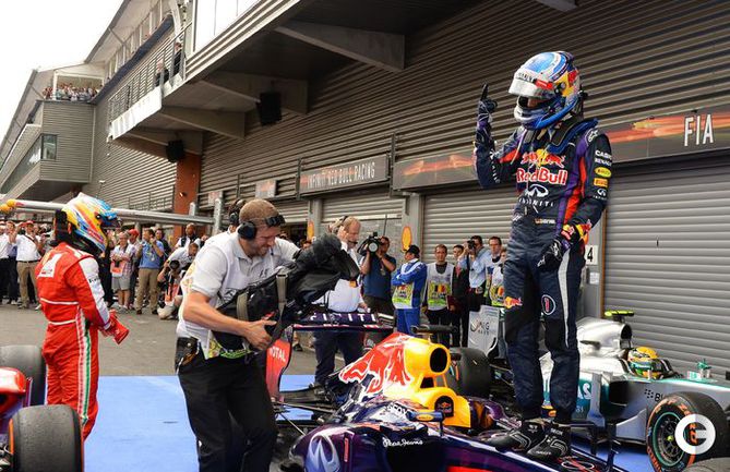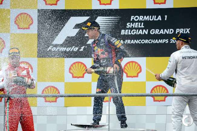 25.08.2013. Формула-1. Спа (Бельгия). Чемпионат мира. 11-й этап. Лидер личного зачета немецкий пилот "Ред Булла" Себастьян Феттель одержал победу на "Гран-при Бельгии". Вторым к финишу пришел испанец Фернандо Алонсо из "Феррари", третьим – британец Люьис Хэмилтон из "Мерседеса". Фото AFP, REUTERS