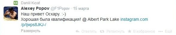 Слова поддержки от первого российского пилота "Формулы-1" Виталия Петрова: "Даниил, хорошая работа, так держать".