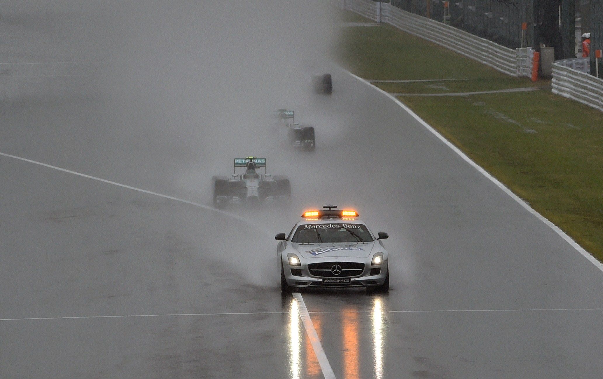 Машина безопасности чересчур долго находилась на трассе, и ушла в боксы после завершения девяти кругов. Уже в этот момент Дженсон Баттон и Пастор Мальдонадо решили рискнуть и поменять дождевую резину на промежуточную. Британский чемпион мира благодаря этому правильному для себя решению поднялся в итоге на третье место после того, как и весь остальной пелотон заехал за промежуточно резиной.