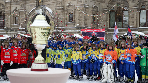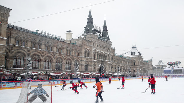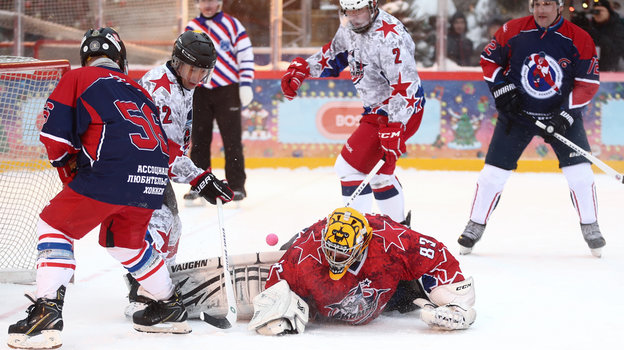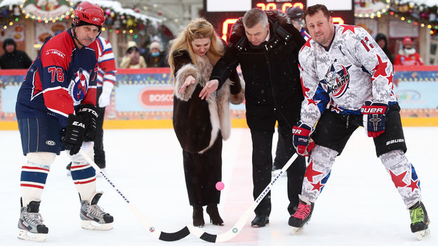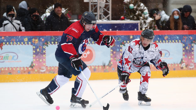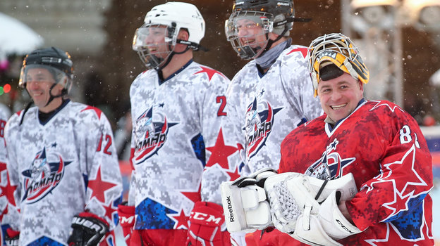 Затем на катке Красной площади состоялся гала-матч по хоккею с мячом между сборными командами артистов театра и кино «Комар» и Ассоциации любительского хоккея «А-линия».