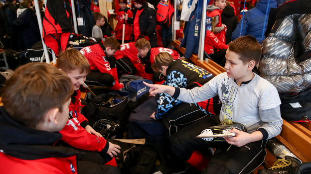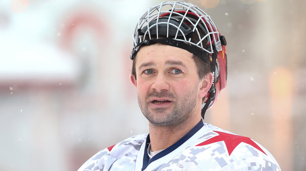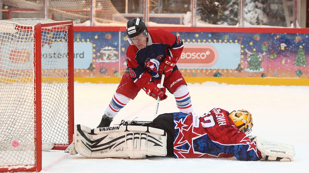 За «Комар» выступает известный в прошлом футболист Дмитрий Сычев, а за его соперников вышел на лед его коллега по сборной России Александр Мостовой.