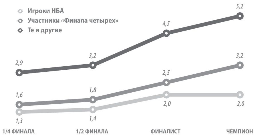 Даже с этими ограничениями деление получилось довольно грубым. Зато вывод – красноречивее некуда: на ЧЕ 2001 – 2011 годов команды тем дальше проходили по "сетке" плей-офф, чем больше в них было игроков двух описанных выше категорий. Естественно, тот или иной конкретный чемпионат не обязательно выигрывала сборная с максимальным количеством "энбэашников" и "евролижников". Но в целом возрастающая прогрессия соблюдалась четко: у команд, вылетавших в 1/4 финала, среднее число таких игроков равнялось 2,9 (1,3+1,6), у потерпевших поражение в 1/2 – 3,2 (1,4+1,8), у серебряных призеров – 4,5 (2,0+2,5) и, наконец, у чемпионов – 5,2 (2,0+3,2)!