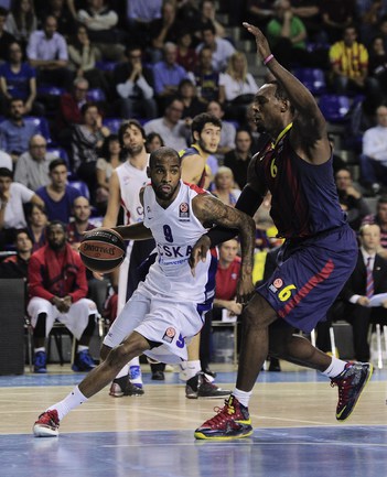 Баскетбол. ЦСКА в матче 1-го группового турнира Евролиги в гостях уступил "Барселоне". Самым результативным игроком встречи стал многолетний лидер каталонцев Хуан Карлос Наварро, набравший 20 очков. У армейцев больше всех очков набрал Владимир Мицов. Эта победа позволила сине-гранатовым обойти российский суперклуб в группе А. Фото AFP