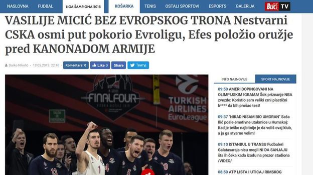 "Баскетболисты ЦСКА победили в Евролиге, выиграв в финале в Витории у "Эфеса", за который выступал наш игрок Василие Мичич. Конечно, все хотели, чтобы единственный серб в этом большом финале завоевал трофей, но он остался без кубка – бросок подвел его в самом важном матче сезона. А армейцы действовали, как в трансе"