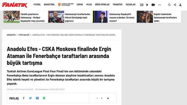 Турецкое издание Fanatik делает акцент не на перипетиях финальной игры между "Эфесом" и ЦСКА, а на противостоянии тренера турецкого клуба с болельщиками "Фенербахче".