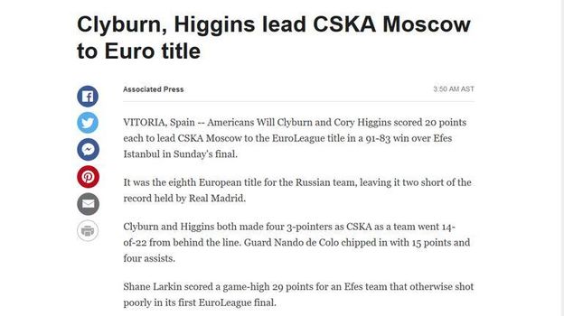 "Американцы Уилл Клайберн и Кори Хиггинс набрали по 20 очков каждый в воскресном финале с "Эфесом" и привели ЦСКА к победе в Евролиге. Это восьмой титул российского клуба и теперь он всего на два отстает от мадридского "Реала". Шейн Ларкин стал самым результативным игроком встречи, заработав 29 очков, но в целом его "Эфес" в первом для себя финале Евролиги выглядел блекло".