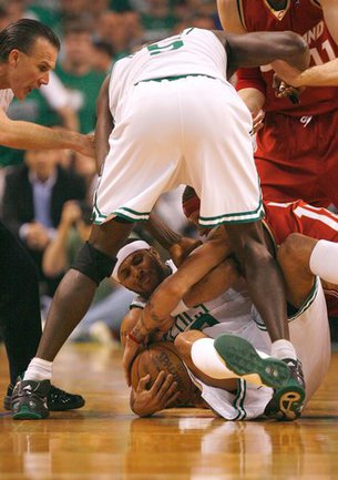 А затем настало время Пола Пирса, который, впрочем, и так всю игру вел за собой нападение хозяев. В начале последней минуты четвертой четверти легкий форвард "Бостона" оказался в правильном месте после розыгрыша спорного мяча. Атака "Кельтов" результативным броском не завершилась, зато им удалось отбиться в защите против Леброна. Гостям оставалось уповать на быстрые фолы и промахи бостонцев с линии штрафных. Эта тактика едва не принесла успех: за 8,5 до сирены "Кливленд" вновь подобрался на расстояние в три очка после точного дальнего попадания Саши Павловича (передачей серба наградил все тот же Джеймс, до этого умудрившийся не попасть один из двух штрафных). Последовало очередное нарушение на Пирсе. Мяч после его броска ударился о дужку, подскочил и... опустился в сетку. На этом все было кончено. |