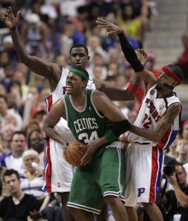 Исход шестой игры, оказавшейся последней в финальной серии Восточной конференции, как и ожидалось, решился в противостоянии лидеров "Селтикс" и "Пистонс". Но если Пол Пирс, Рэй Аллен и Кевин Гарнетт каждый выполнили свою задачу, что принесло гостям итоговую победу и выход в финал плей-офф, то "Детройт", долгое время лидировавший благодаря усилиям Чонси Биллапса и Ричарда Хэмилтона (50 очков на двоих), подвел Рашид Уоллес, смазавший 10 бросков с игры из 12, ставший "лидером" команды по потерям (3) и закончивший встречу с худшим показателем полезности - "-15". |