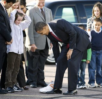 Президент США Барак Обама, известный своей любовью к баскетболу, получил необычный презент по прилете в Финикс - именные бело-оранжевые кроссовки звезды "Санс" Шакила О'Нила 57-го размера с автографом игрока. Это подарок ему преподнес сын главы муниципалитета Финикса, который встречал президента у трапа самолета. Как сообщает TSN, взяв кроссовку в руки, Обама в шутку попытался примерить ее, после чего поблагодарил мальчика за подарок и уехал из аэропорта на своем лимузине. |