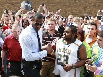 В Эйкроне, что в 45 минутах езды от Кливленда, состоялась церемония вручения приза самого полезного игрока сезона Леброну Джеймсу. В школе "Сент-Винсент - Сент-Мэри", где будущий MVP НБА начинал свой путь в баскетболе, весь день был посвящен предстоящим торжествам. Коридоры были украшены цветами двух команд Джеймса: школьной - "Файтинг Айриш" (зелено-золотистые) и нынешней - "Кливленд Кавальерс" (бордово-золотистые). Напомним, сразу после окончания школы шесть лет назад форвард выставился на драфт НБА, предпочтя профессиональный баскетбол высшему образованию. |