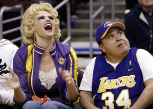 Звезды Голливуда Дэнни ДеВито и Анна-Николь Смит выбрались в "Стэйплз Центр" для того, чтобы поболеть за любимую команду "Лейкерс". Вот только время они избрали не самое удачное, ведь минувшей ночью команда Шакила O'Нила и Коби Брайанта встречалась с лидером Запада - "Сакраменто". Баскетболисты из Лос-Анджелеса уступили со счетом 101:103. |
