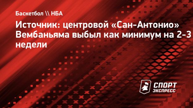 Центровой «Сан-Антонио» Виктор Вембаньяма выбыл из строя как минимум на 2-3 недели, сообщает AP со ссылкой на источник.