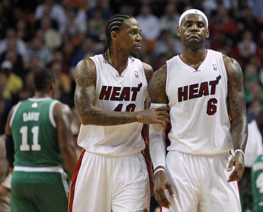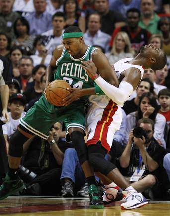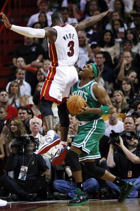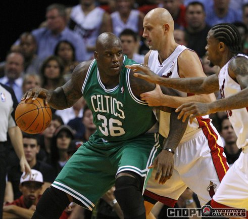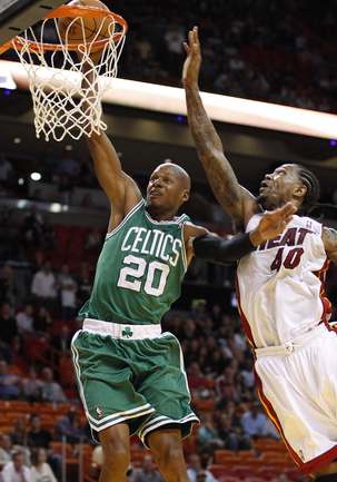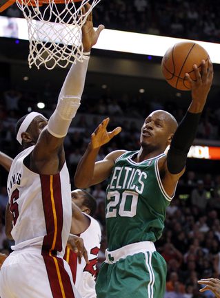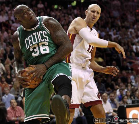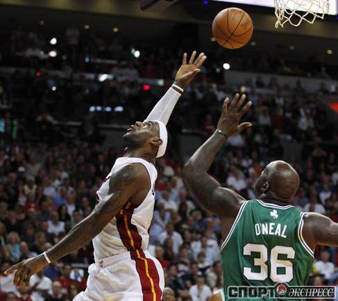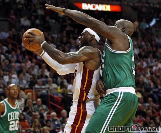 НБА. Регулярный чемпионат. "Майами" - "Бостон" - 107:112. М: Бош (15 + 7 подборов), Л. Джеймс (35 + 10 подборов + 9 передач), Дж. Энтони (0), Арройо (4), Уэйд (8 + 6 потерь); Стэкхаус (2), Илгаускас (6), Хаус (13), Джеймс Джонс (3), Хаслэм (21 + 10 подборов), Челмерс (0).Б: Гарнетт (16 + 13 подборов), Пирс (25), Ш. О'Нил (5), Р. Аллен (35), Рондо (8 + 16 передач); М. Дэниэлс (2), Н. Робинсон (12), Г. Дэвис (6 + 9 подборов), Эрден (3). Фото REUTERS