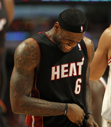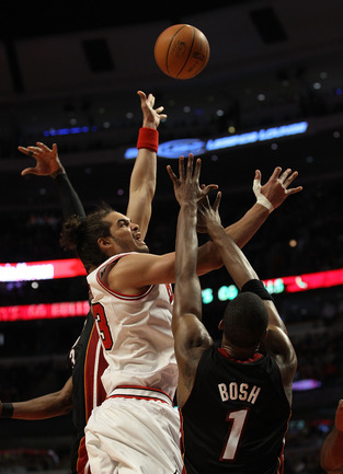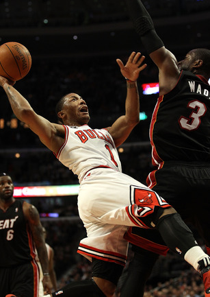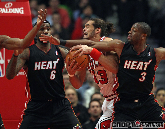 НБА. Регулярный чемпионат. "Чикаго" - "Майами" - 93:89 (23:31, 21:22, 27:14, 22:22). Ч: Роуз (26), Денг (20 + 10 подборов), Бузер (16 + 9 подборов), Р. Брюэр (8), Ашик (0 + 11 подборов). М: Уэйд (34 + 8 подборов), Л. Джеймс (29 + 10 подборов), Челмерс (12), Бош (7 + 9 подборов). Фото AFP