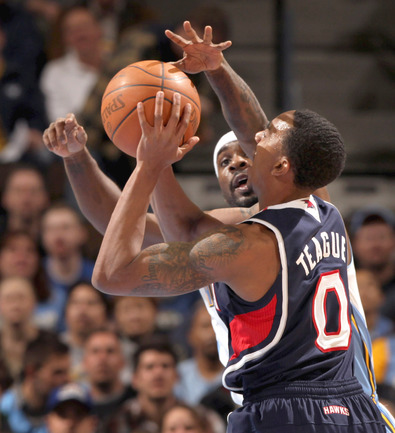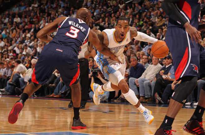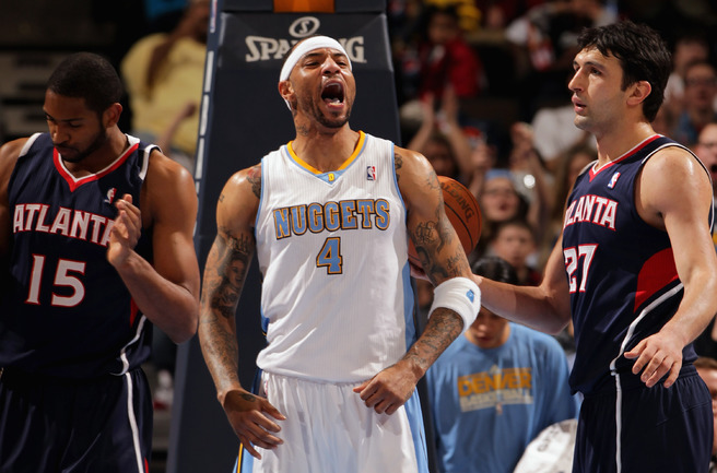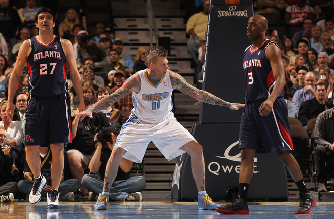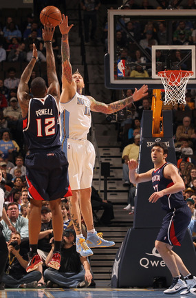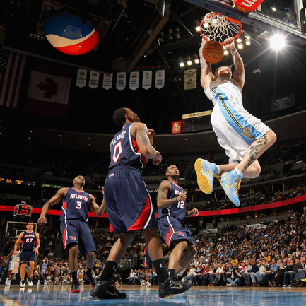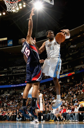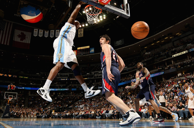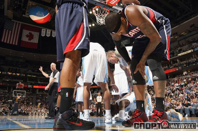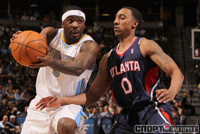 НБА. Регулярный чемпионат. "Денвер" - "Атланта" - 100:90 (21:25, 25:22, 25:23, 29:20). Д: Джей. Ар. Смит (19 + 7 подборов), Фелтон (16 + 7 передач), У. Чендлер (15), Кен. Мартин (14 + 11 подборов), Нене (13). А: Джо Джонсон (22), Хорфорд (21 + 16 подборов), Марв. Уильямс (13), Джам. Кроуфорд (11), Джош Смит (10). Российский центровой "Денвера" Тимофей Мозгов с момента своего обмена из "Нью-Йорка" еще ни разу не выходил на паркет. Фото AFP