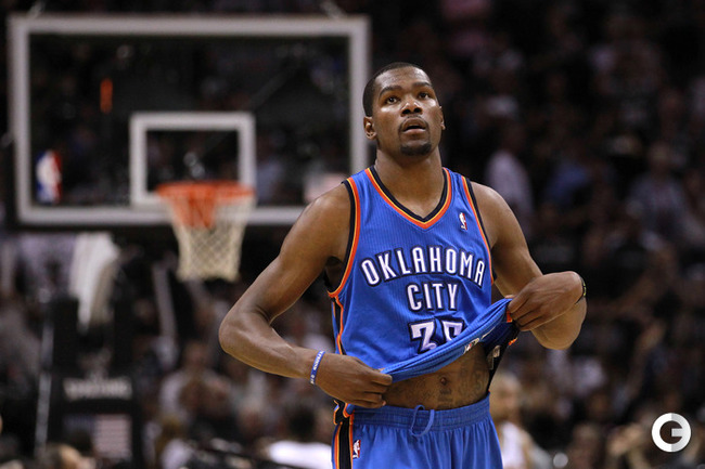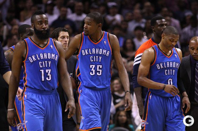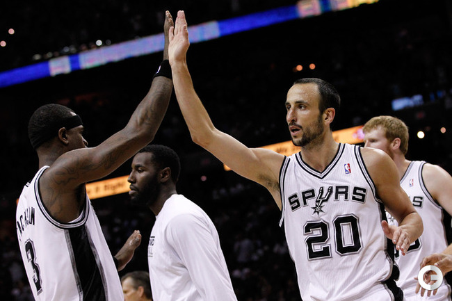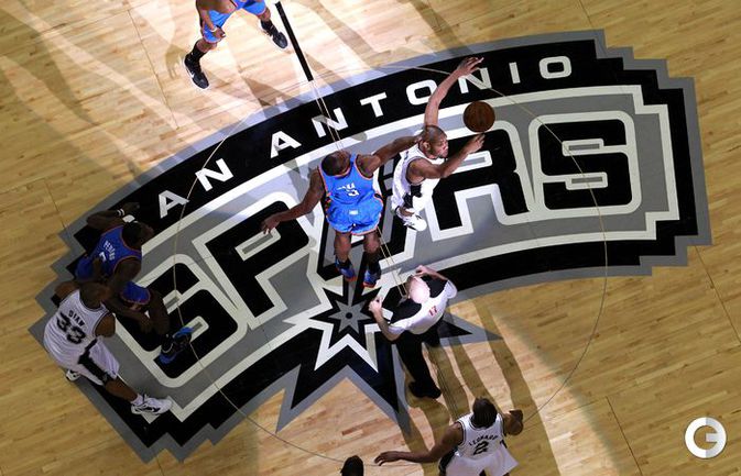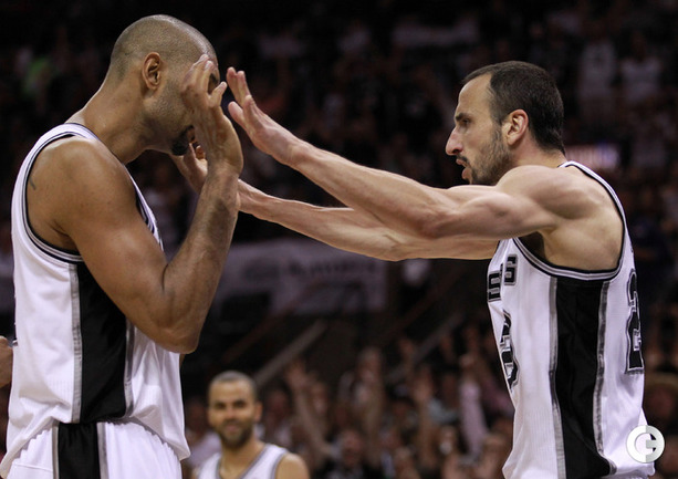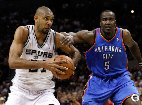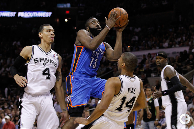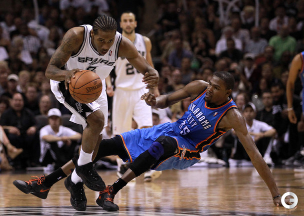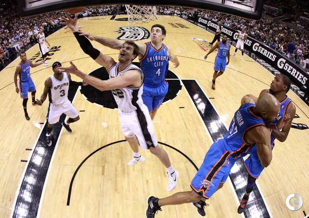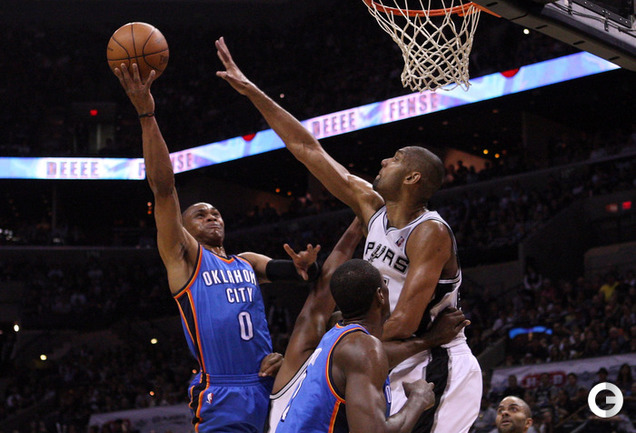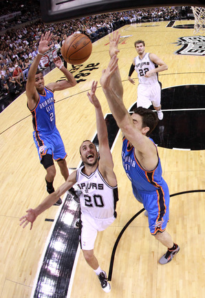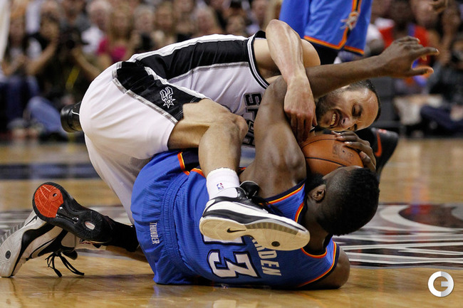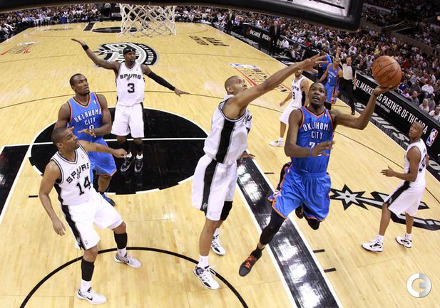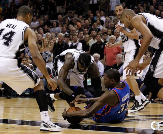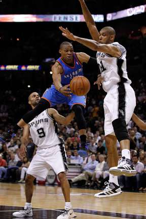 НБА. Плей-офф. 1/2 финала. Западная конференция. Первый матч. "Сан-Антонио" - "Оклахома-Сити" - 101:98 (24:18, 22:29, 16:24, 39:27). С: Жинобили (26 + 5 подборов), Т. Паркер (18 + 8 подборов), Данкан (16 + 11 подборов), Нил (12). О: Дюрант (27 + 10 подборов + 4 передачи), Харден (19 + 6 подборов), Уэстбрук (17), Фишер (13).Счет в серии: 1-0. Фото AFP
