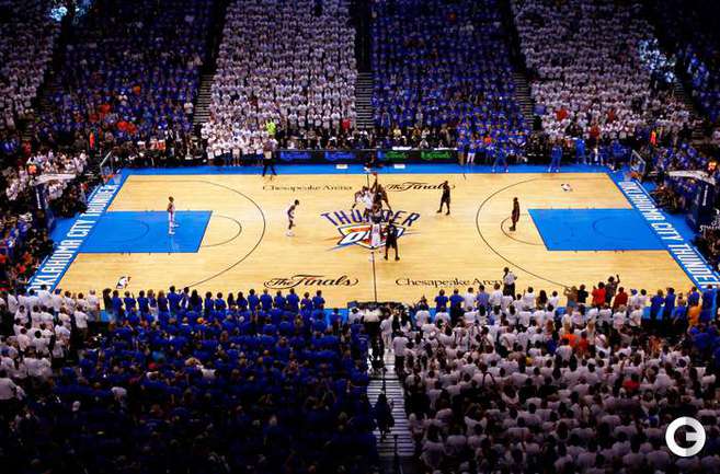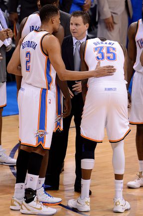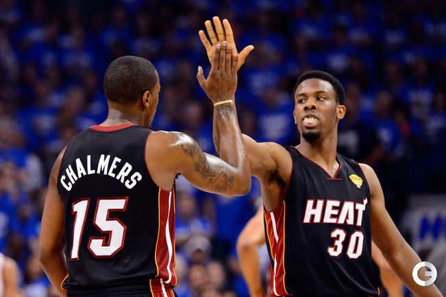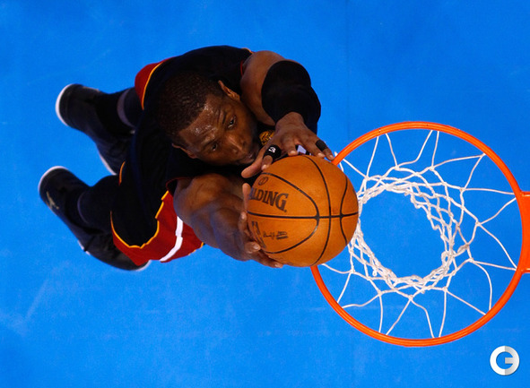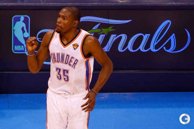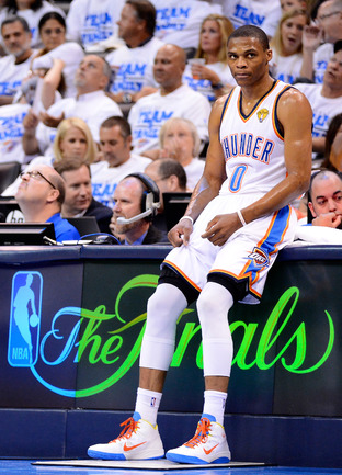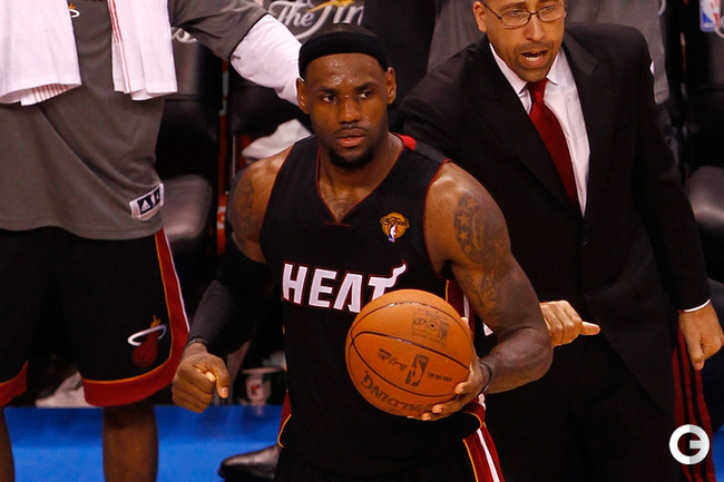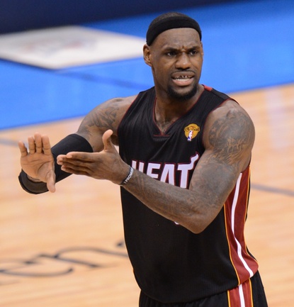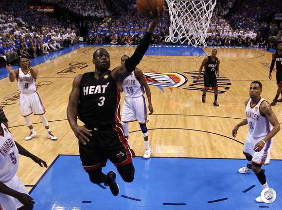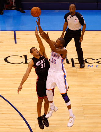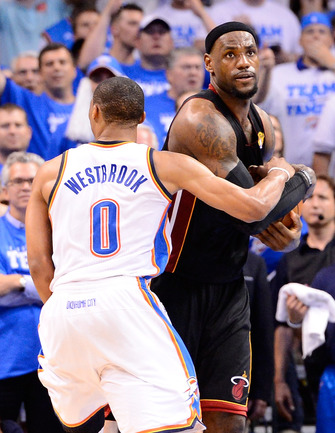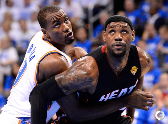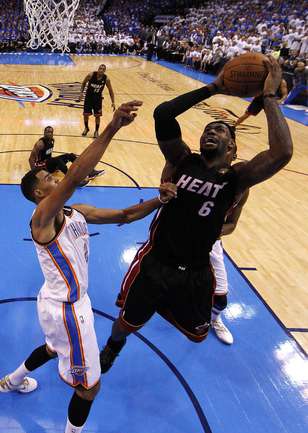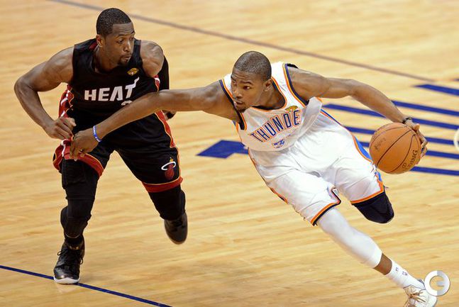 НБА. Плей-офф. Финал. Второй матч. "Оклахома-Сити" - "Майами" - 96:100 (15:27, 28:28, 24:23, 29:22). О: Дюрант (32), Уэстбрук (27 + 8 подборов + 7 передач), Харден (21), Ибака (7 + 5 блок-шотов), Перкинс (4 + 8 подборов), Сефолоша (3), Фишер (2), Н. Коллисон. М: Л. Джеймс (32 + 8 подборов), Уэйд (24), Баттье (17), Бош (16 + 15 подборов), Челмерс (3), М. Миллер (2), Джеймс Джонс (2), Хаслэм (2), Коул (2). Счет в серии: 1-1 (105:94). Фото AFP