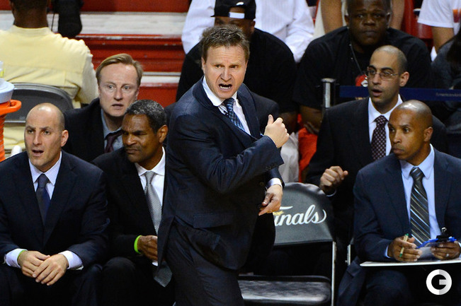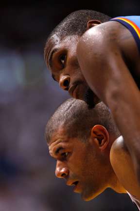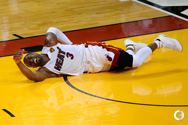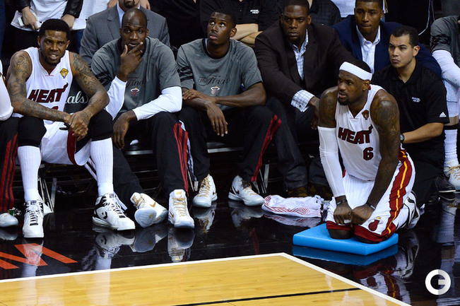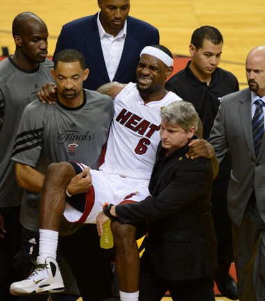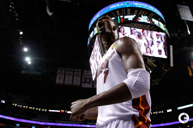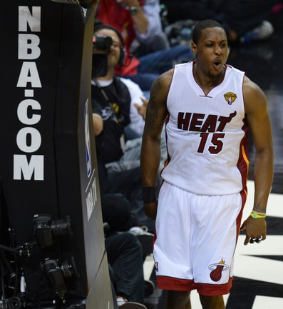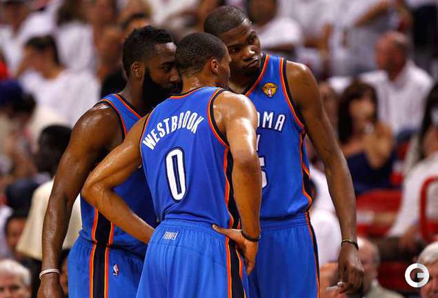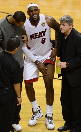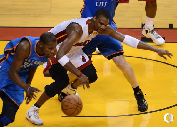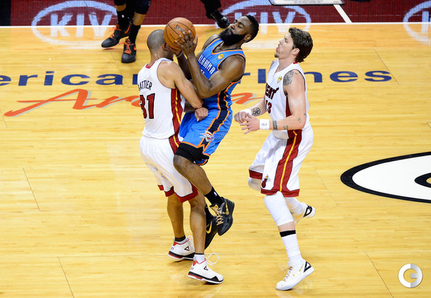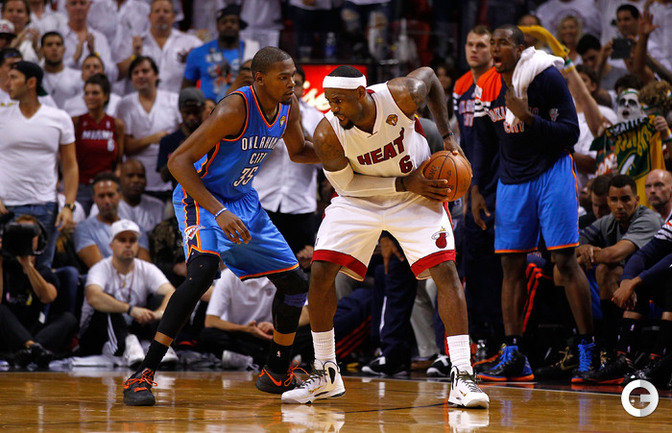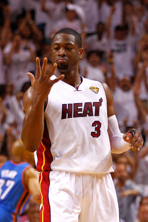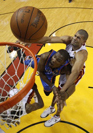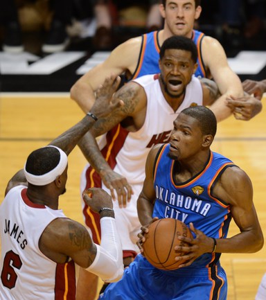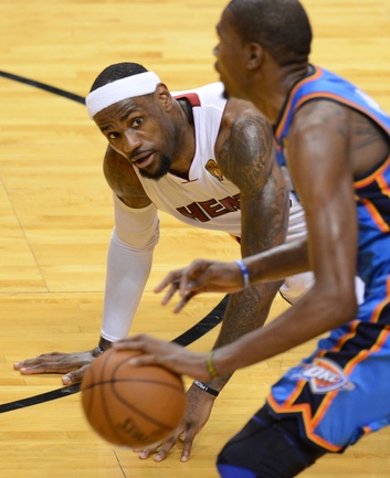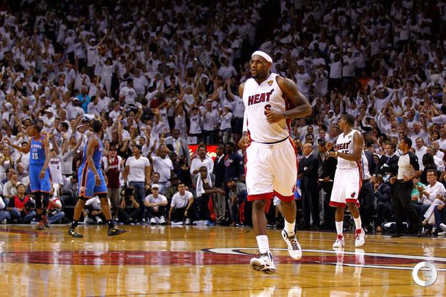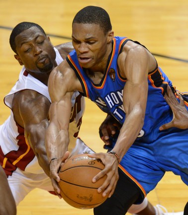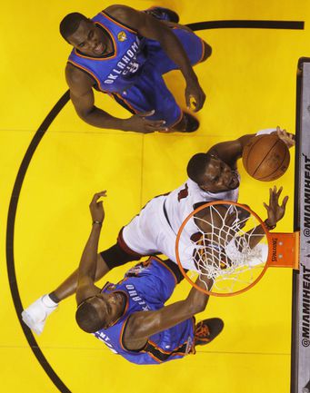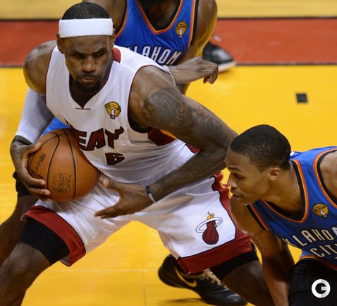 НБА. Плей-офф. Финал. Четвертый матч. "Майами" - "Оклахома-Сити" - 104:98 (19:33, 27:16, 33:26, 25:23). М: Л. Джеймс (26 + 9 подборов + 12 передач), Уэйд (25), Челмерс (25), Баттье (17), Бош (13 + 9 подборов), Коул (8). О: Уэстбрук (43 + 7 подборов + 5 передач), Дюрант (28), Харден (8 + 10 подборов), Н. Коллисон (6), Сефолоша (3), Ибака (4 + 7 подборов). Счет в серии: 3-1 (94:105, 100:96, 91:85). Фото AFP