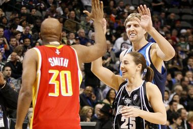 Кстати, дальним броскам по традиции было посвящено отдельное состязание. В нем победа досталась форварду "Бостона" Полу Пирсу, который сразу же, "не отходя от кассы", принял поздравления и от своего одноклубника Кевина Гарнетта, и от знаменитого центрового "Селтикс" 60-х Билла Расселла. Прославленный 76-летний ветеран, кстати, наблюдал за событиями "Субботнего вечера" из первого ряда, частенько подтрунивая над их участниками. Среди них, кстати, была и Бекки Хэммон. Бывшая разыгрывающая ЦСКА и сборной России уже во второй раз стала победительницей конкурса "Звезды-снайперы". Впервые - два года назад в команде Сакраменто вместе с Тимом Данканом и Дэвидом Робинсоном, теперь - в сборной Техаса с Дирком Новицки и Кенни Смитом. Глядя на то, с каким трудом малышка Бекки (168 см) с разбега швыряла в корзину мячи из центрального круга, нельзя было ее не пожалеть - еле добрасывала. Впрочем, закончилось все благополучно - Смит забил.