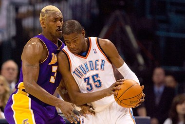 Кто бы мог еще неделю назад представить, что действующие чемпионы будут дважды биты командой, полностью (включая главного тренера) состоящей из дебютантов плей-офф, а в матче № 4 потерпят самое крупное поражение в плей-офф со времен последнего матча финала-2008 против "Бостона", в котором бросили сопротивляться задолго до финальной сирены? Вот и на сей раз Фил Джексон досрочно выбросил белый флаг. Ни один из игроков "Лейкерс" не набрал больше 13 очков, а в четвертой 12-минутке на паркете находился только один представитель стартовой пятерки - Эндрю Байнум. В последний раз гости вели в самом начале - 8:7 после попадания Поу Газоля, на что Кевин Дюрант ответил звонким "гвоздем". А вот его суперзвездный визави Коби Брайант расчехлил свою снайперскую пушку лишь во второй 12-минутке. Одна проблема - было уже поздно! Первый период ознаменовался блестящим рывком "Оклахома-Сити" 12:0, после чего преимущество хозяев ни разу не опустилось ниже двузначной отметки.