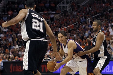 Лишь по три игрока в составе каждой из команд показали двузначную результативность, но при этом все они набрали минимум по 20 очков. А особенно активен в первой половине был Стив Нэш. Разыгрывающий, травмировавший правое бедро в заключительном поединке серии с "Портлендом", похоже, успел полностью восстановиться. Нэш реализовал пять первых бросков подряд, продемонстрировав при этом большое техническое разнообразие. В одном из эпизодов он "раскачал" сразу двух соперников на 7-метровой дуге, в другом ушел вдоль лицевой линии из-под блок-шота Тима Данкана и вслепую забил себе за спину, а завершил серию трехочковым попаданием - 14:5 в пользу "Финикса"! По итогам первой 12-минутки в активе канадца было 17 очков. Отставание, достигавшее "-12", гости отыграли в середине третьей четверти. Но за 1.23 до финальной сирены Квентин Ричардсон реализовал важнейший трехочковый - 103:95, а в оставшееся время хозяева успешно реализовали штрафные. До этого "Санз" трижды подряд проигрывали "Сан-Антонио" стартовые матчи серий.
