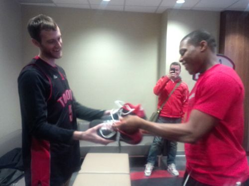 Но справедливость все же восторжествовала! Вэйла пригласили на вчерашнюю тренировку "Торонто", где Лаури вручил своему фанату новенькие кроссовки.