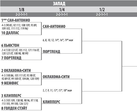 С учетом того, как на "Западе" развивались события в первом раунде, невысока вероятность, что хоть кому-то из претендентов удастся пробиться в финал конференции меньше, чем за семь матчей. Как говорится, приготовьте поп-корн и устраивайтесь поудобнее перед вашими голубыми экранами.