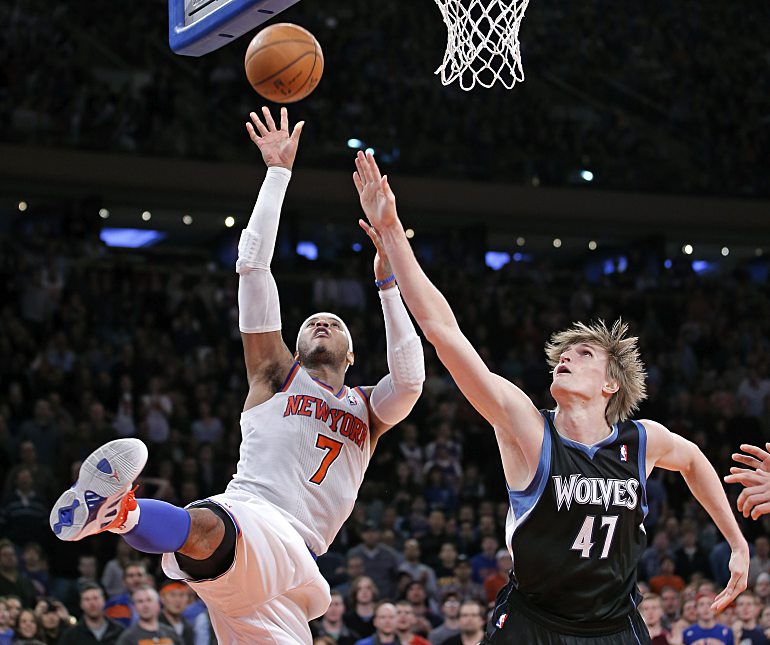 Декабрь 2012 года. Форвард "Миннесоты" Андрей КИРИЛЕНКО (справа) против форварда "Нью-Йорка" Кармело ЭНТОНИ. Фото REUTERS