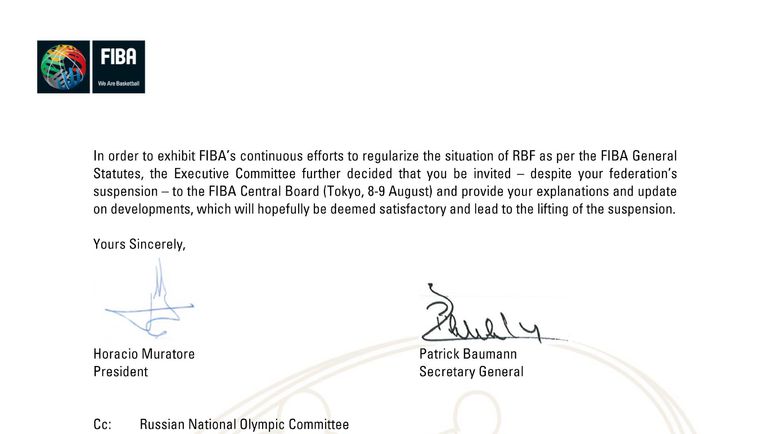 Письмо ФИБА в адрес РФб об отстранении сборных