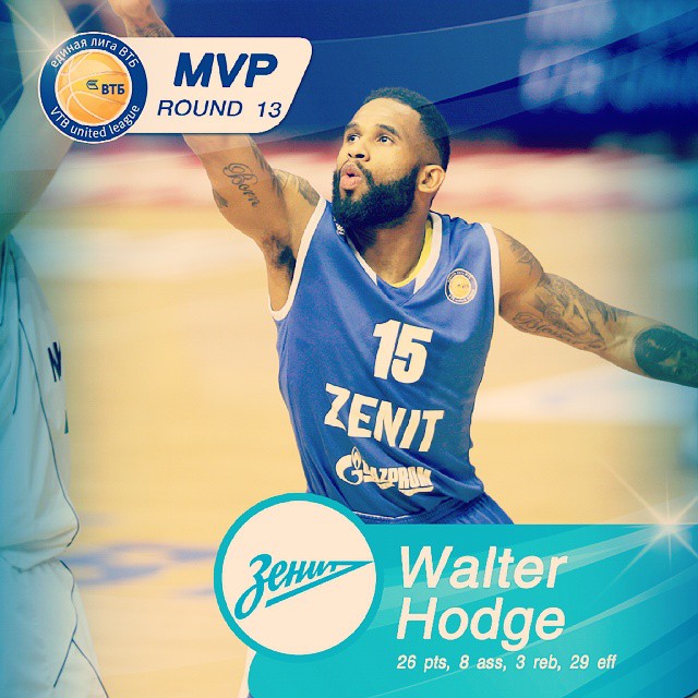 Защитник "Зенита" Вальтер Ходж признан самым ценным игроком 13-го тура регулярного чемпионата Единой лиги ВТБ, информирует официальный сайт турнира. В матче с "Нижним Новгородом" 28-летний игрок набрал 26 очков, 8 передач, 3 подбора, 3 перехвата и 29 баллов за эффективность, а питерцы одержали вторую победу подряд.