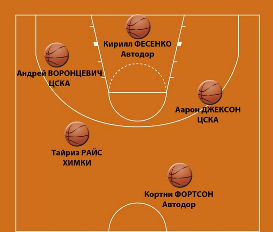 Очки. 1. Калпеппер (Красный Октябрь) – 21,5. 2. Фортсон (Автодор) – 19,3. 3. Фрейманис (Калев) – 18,8. 4. Дж.Робинсон (ВЭФ) – 18,4. 5. Рочести (Нижний Новгород) – 18,3.
