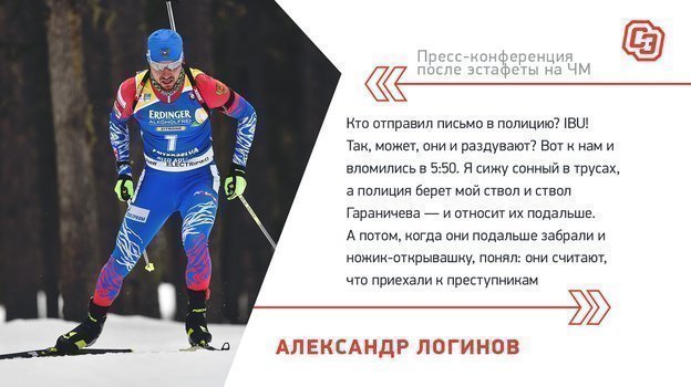 Российский биатлонист Александр Логинов после субботней истории с обыском его машины и номера в отеле сборной на чемпионате мира-2020 в Антерсельве прервал молчание по допинговой теме. Сначала спортсмен сделал ряд заявлений об эритропоэтине в телеэфире во время эстафетной гонки, а затем развил мысль о возможном уходе из спорта на пресс-конференции.