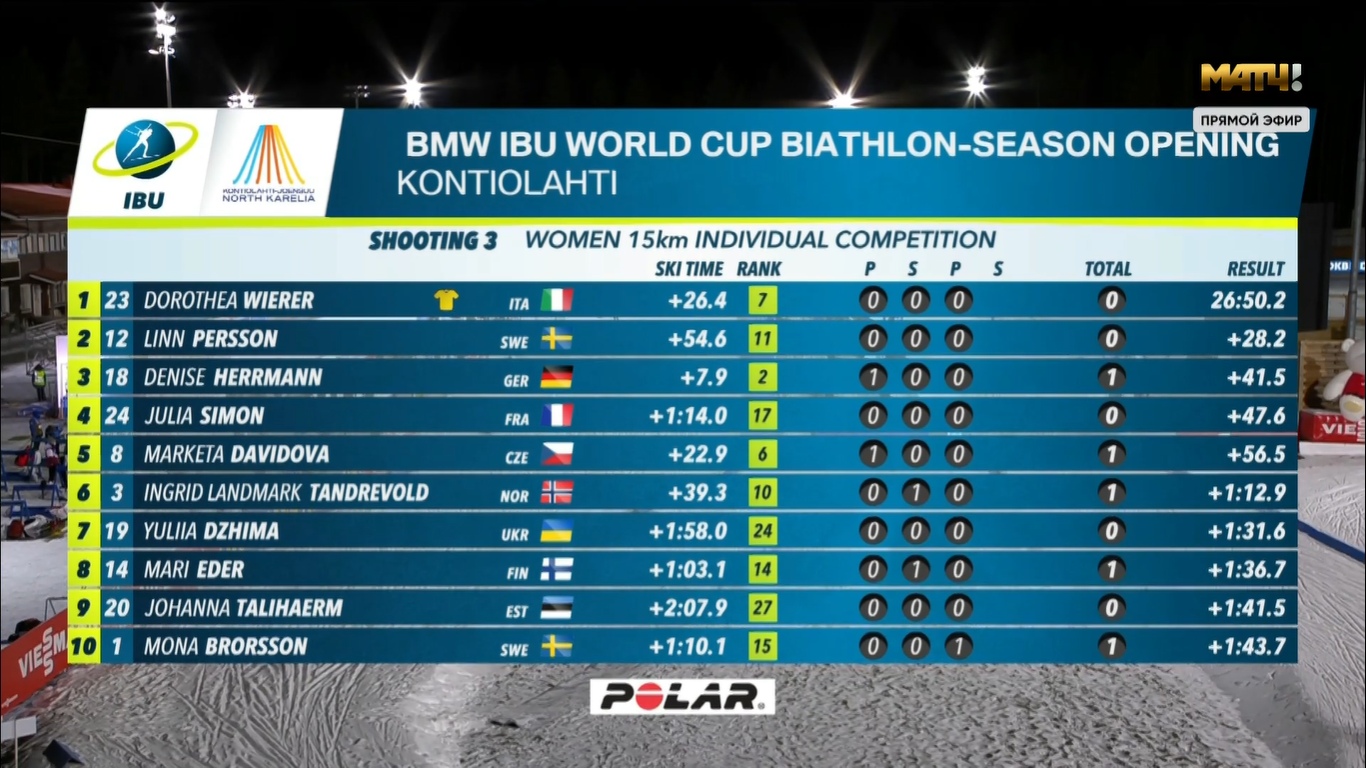 А вот Павлова мажет. Пока у нее промежуточное третье место и минута отставания как раз от Брорссон — за промах.