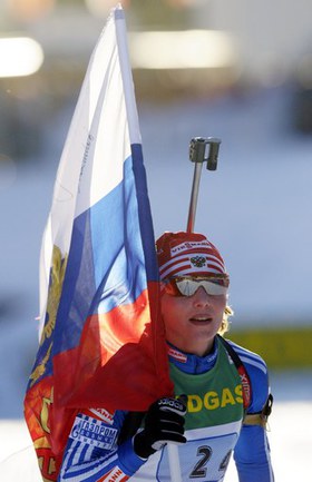 Финишер российской команды Альбина Ахатова на своей первой стрельбе продемонстрировала чудеса скорострельности и точности. Кати Вильхельм пришлось завернуть на два штрафных круга, и борьба за вторую позицию развернулась между француженкой Сандрин Бэйи и норвежкой Турой Бергер, которые проигрывали россиянке 2.13,9 и 2.26,1 соответственно. На втором огневом рубеже Ахатова допустила один промах, но тут же закрыла мишень дополнительным патроном и позволила российским болельщикам констатировать: "Победа будет за нами!". |