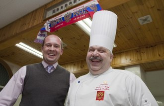В этот момент к нашему разговору присоединился шеф-повар. В накрахмаленном, белоснежном гофрированном колпаке Анатолий Галкин выглядел импозантным и довольным - как и должен выглядеть повар, на глазах которого приготовленная им еда стремительно исчезает с тарелок. Что, собственно, неудивительно: Галкин с 1983 года был личным поваром первого президента СССР Михаила Горбачева, неоднократно сопровождал его в поездках. |
