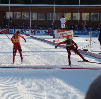 После безупречной первой стрельбы на "лежке" в лидеры вышли Свендсен и Зуманн. Первый в итоге нацелился на победу, а второго подвели две незакрытые мишени на третьем рубеже. "Стоя" ошибался и Свендсен. Но не фатально. К финишу норвежец помчался после синхронных промахов и заездов на штрафной круг с вышедшим на первое место Бьорндаленом. Все решилось на заключительных метрах дистанции. И на них Свендсен опередил лидера общего зачета Кубка мира, удачнее противника "выбросив" лыжу на финише. |