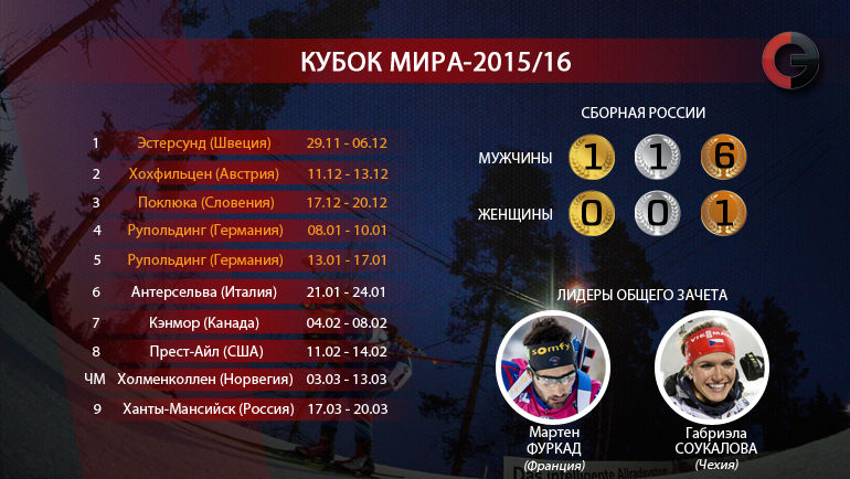 Желтые майки лидеров сезона сохраняют француз Мартен Фуркад и чешская биатлонистка Габриэла Соукалова. Лучший из россиян в общем зачете у мужчин – Шипулин, 4-е место (414 очков против 655 у Фуркада), 6-й – Гараничев (391). Лучшая из россиянок – Ольга Подчуфарова, 11-е место (329 очков против 611 у Соукаловой).
