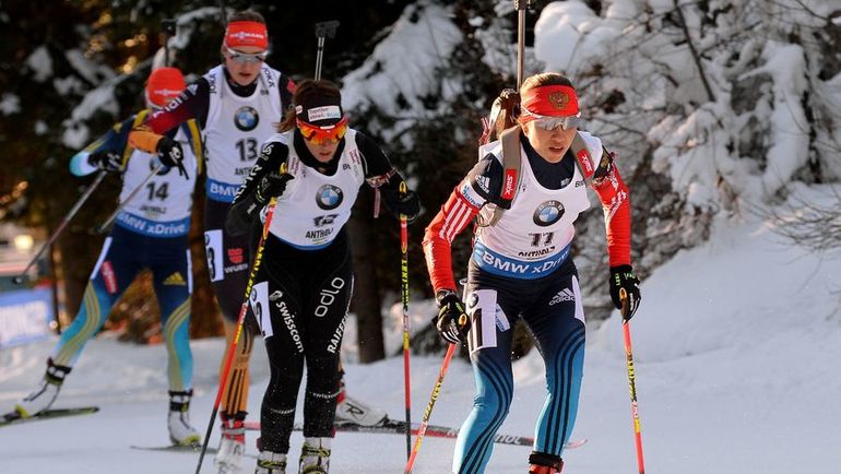 Дальмайер и Домрачева. Виролайнен и Данкли. Плотным строем вступают девушки в гонку.