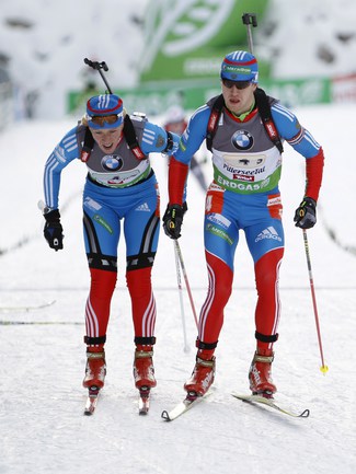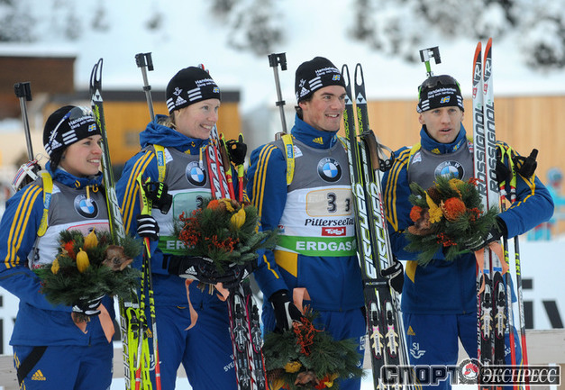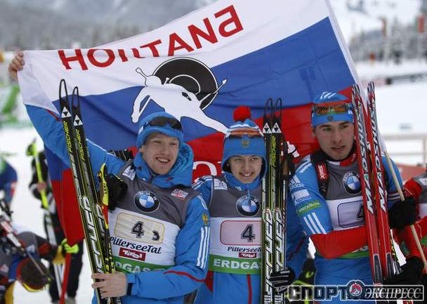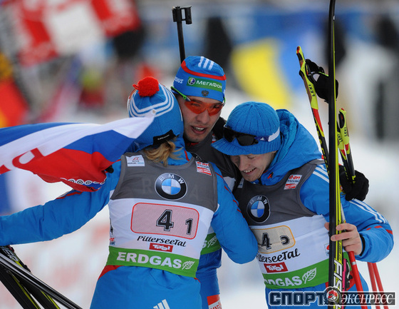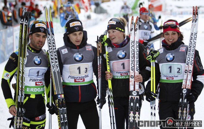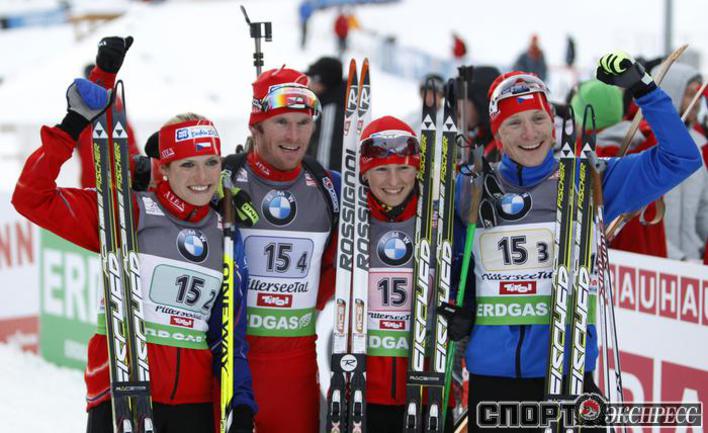 Биатлон. Хохфильцен (Австрия). Кубок мира. 3-й этап. Мужчины/Женщины. Смешанная эстафета. 1. РОССИЯ (Ольга ВИЛУХИНА, Ольга ЗАЙЦЕВА, Алексей ВОЛКОВ, Антон ШИПУЛИН) - 1:13.33,4 (0 штрафных кругов + 5 дополнительных патронов). Фото REUTERS и AFP